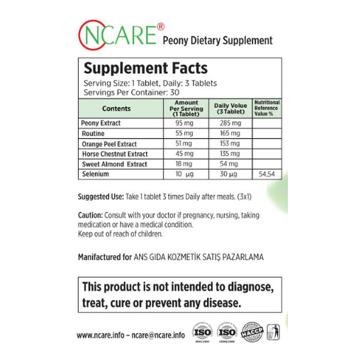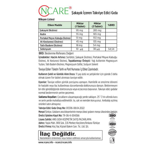 Daha önceki ürünümüzde 3x3 olarak kullanılması önerilen NCARE Şakayık Tablet yeni üretimde doz birleşimi yapıldığı için 3x1 (sabah-öğle-akşam) kullanılmalıdır. Bu sebeple kutu içeriği de 30 adet olarak değiştirilmiştir.
